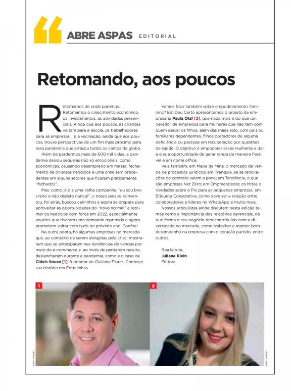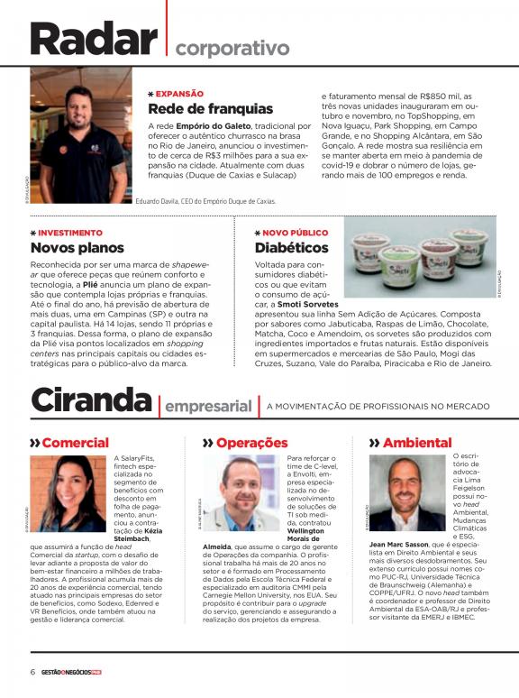 Voltada especialmente para os micros, pequenos e médios empresários, a revista é um verdadeiro guia de soluções para as questões que são entraves no dia a dia de um empreendedor. Fornece as melhores opções de investimento no mercado, além de dicas para potencializar sua carreira e seus negócios.