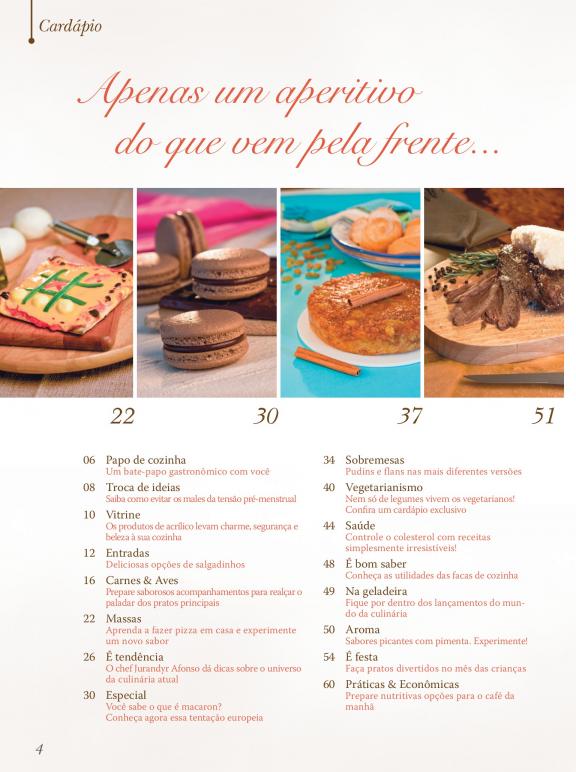 Esta revista compromete-se a ensinar, todos os meses, receitas rápidas e simplesmente deliciosas tanto a dona de casa como para quem chega em casa ao final do dia sem muito tempo para cozinhar.