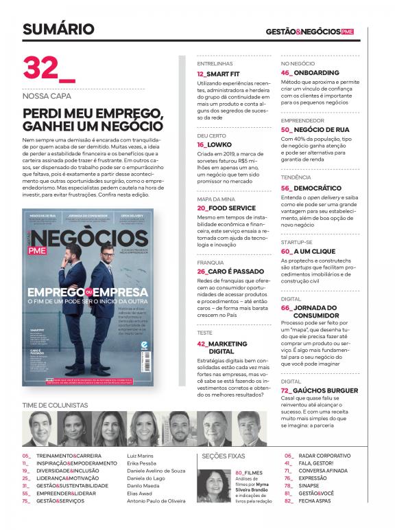 Voltada especialmente para os micros, pequenos e médios empresários, a revista é um verdadeiro guia de soluções para as questões que são entraves no dia a dia de um empreendedor. Fornece as melhores opções de investimento no mercado, além de dicas para potencializar sua carreira e seus negócios.
