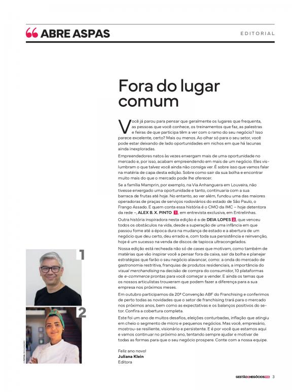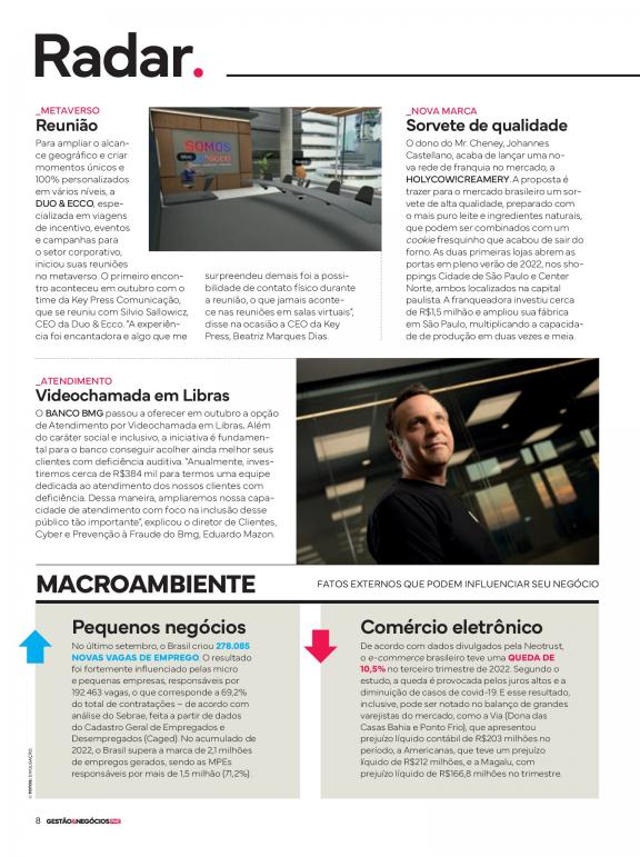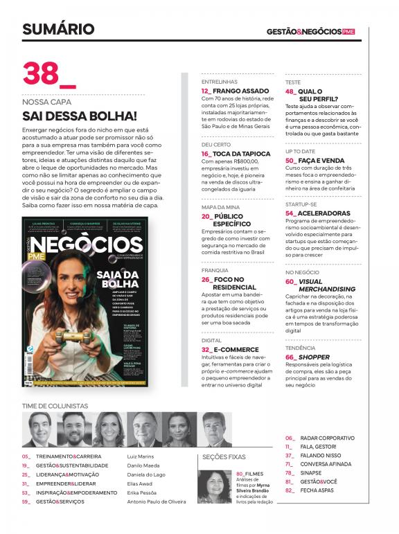 Voltada especialmente para os micros, pequenos e médios empresários, a revista é um verdadeiro guia de soluções para as questões que são entraves no dia a dia de um empreendedor. Fornece as melhores opções de investimento no mercado, além de dicas para potencializar sua carreira e seus negócios.