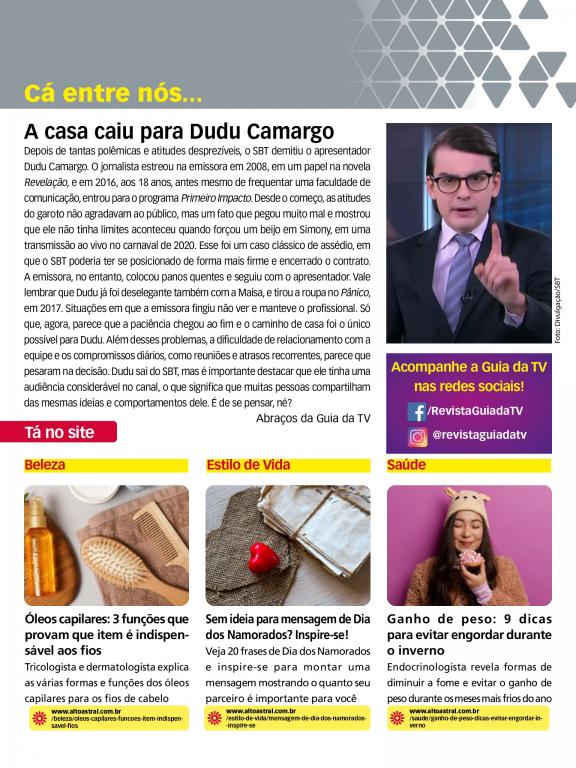O mundo dos artistas, bastidores da TV, flagras incríveis, entrevistas e pôsteres dos famosos. E mais: resumo de todas as novelas e revelações exclusivas sobre os personagens.