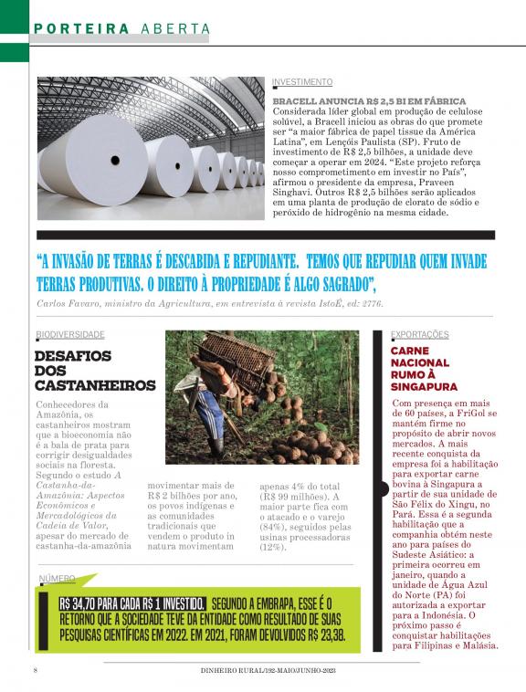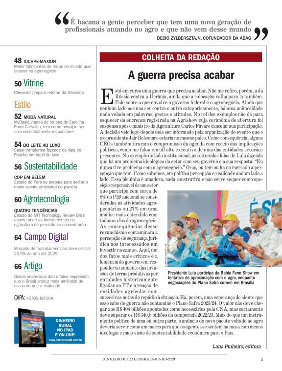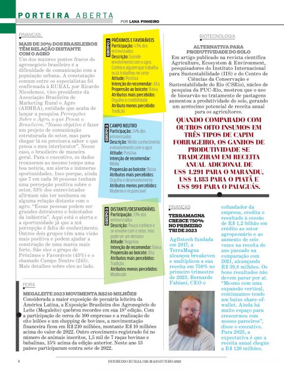 Reconhecida como a única revista do Brasil a tratar o Agronegócio por seu viés corporativo, Dinheiro Rural aproxima os empresários rurais do universo urbano através de um jornalismo especializado com linguagem dinâmica e fácil.