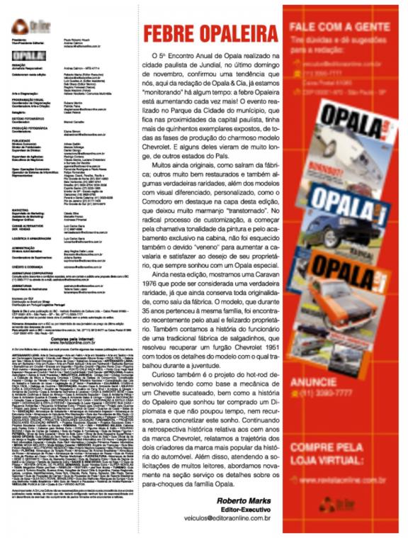 Guia para amantes de Opala, traz matérias especiais com colecionadores, dicas de lojas especializadas em peças e eventos relacionados.