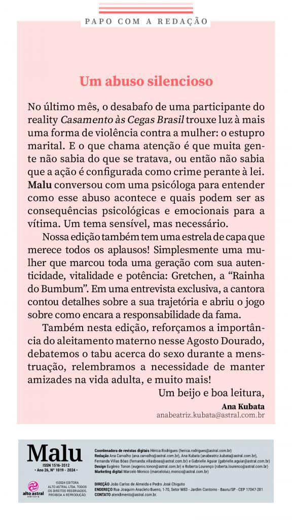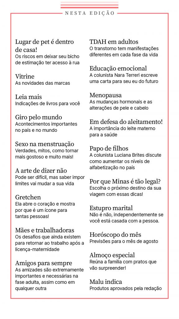 Saúde, beleza, culinária, dietas, mundo dos artistas e dicas para você cuidar de si mesma e de sua família. E mais: um super caderno de receitas com sugestões deliciosas para o seu dia a dia. Não perca!
