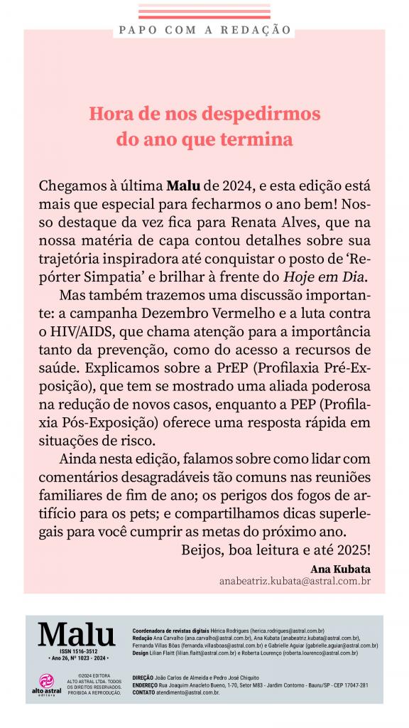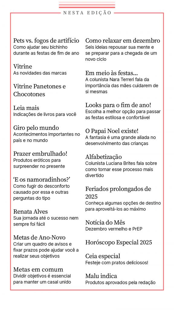 Saúde, beleza, culinária, dietas, mundo dos artistas e dicas para você cuidar de si mesma e de sua família. E mais: um super caderno de receitas com sugestões deliciosas para o seu dia a dia. Não perca!